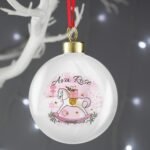 This cute pink rocking horse bauble is a perfect way to add a personal touch to your Christmas tree. Personalise this bauble with the following: