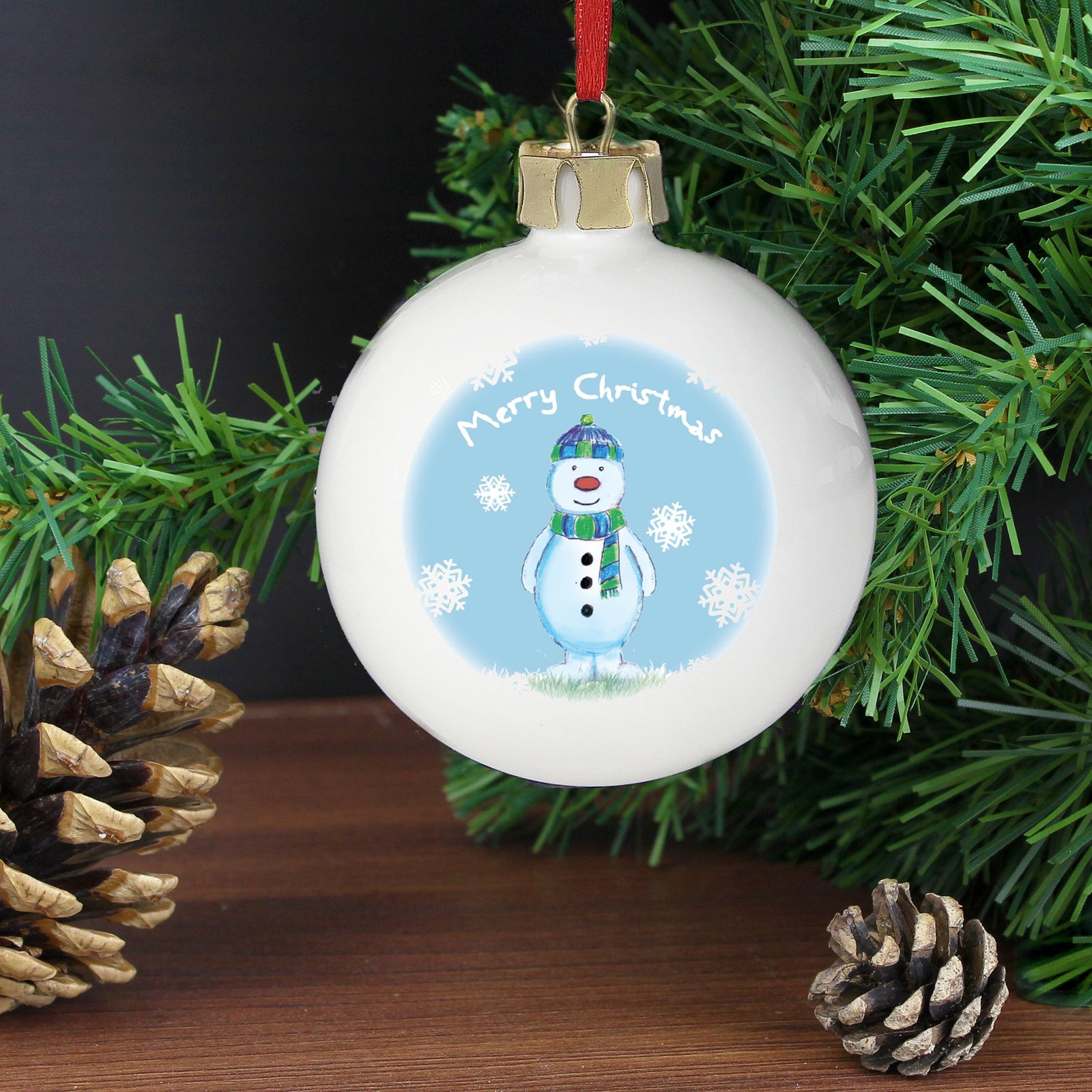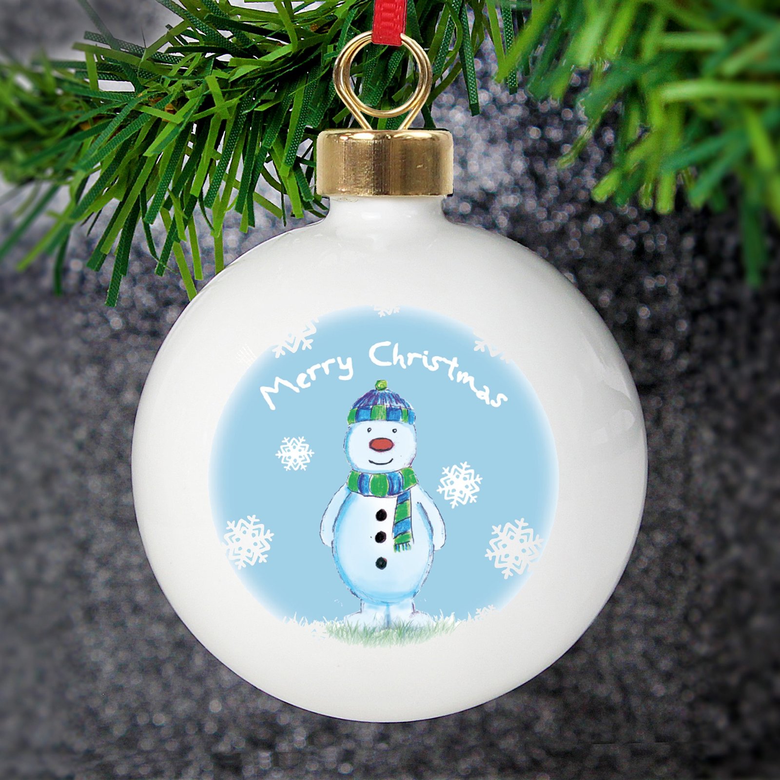 A cute Christmas bauble with a snowman in snow scene design. It can be personalised with any message on the reverse over 4 lines and up to 20 characters per line.
